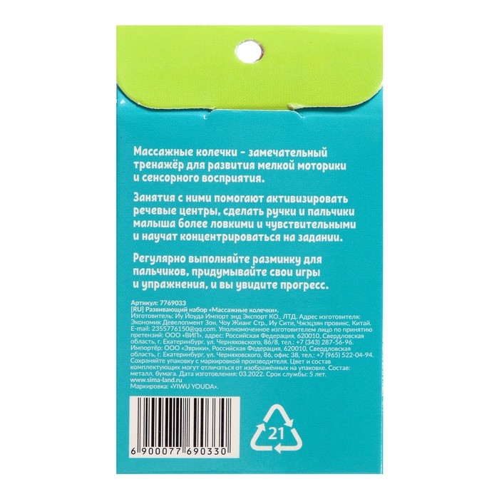 Развивающий набор «Массажные колечки» научит малыша концентрироваться на задании и поможет активизировать речевые центры.