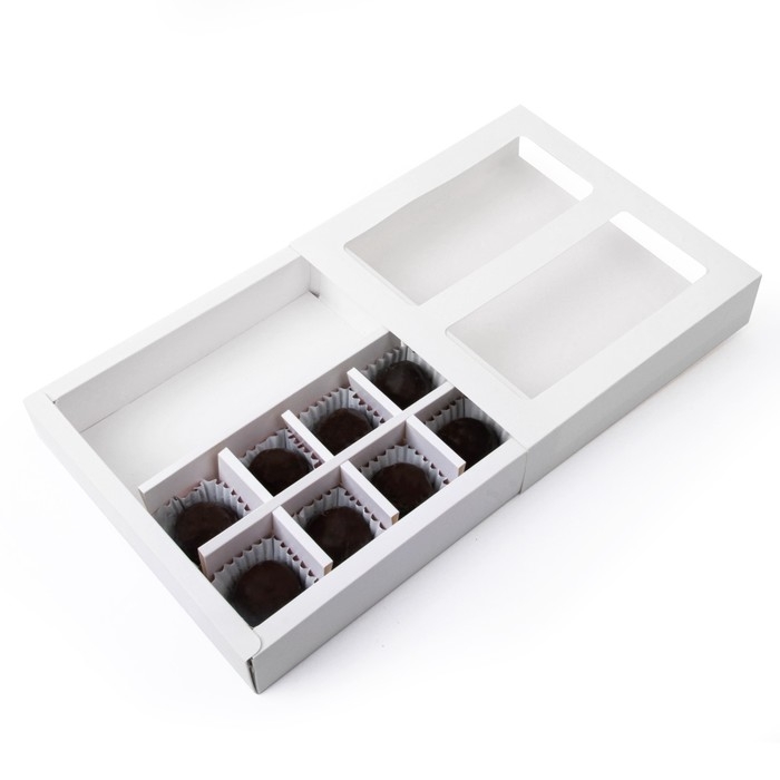 Коробка для 8 конфет + шоколад, с окном, белая, 17,7 х 17,8 х 3,8 см. Кондитерская упаковка