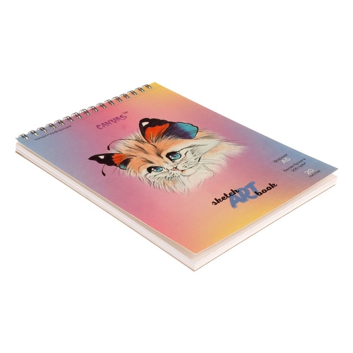 Скетчбук для акварели А5, 20 листов на гребне "Кошка-бабочка", обложка мелованный картон, матовая ламинация, выборочный УФ-лак, блок 200 г/м2