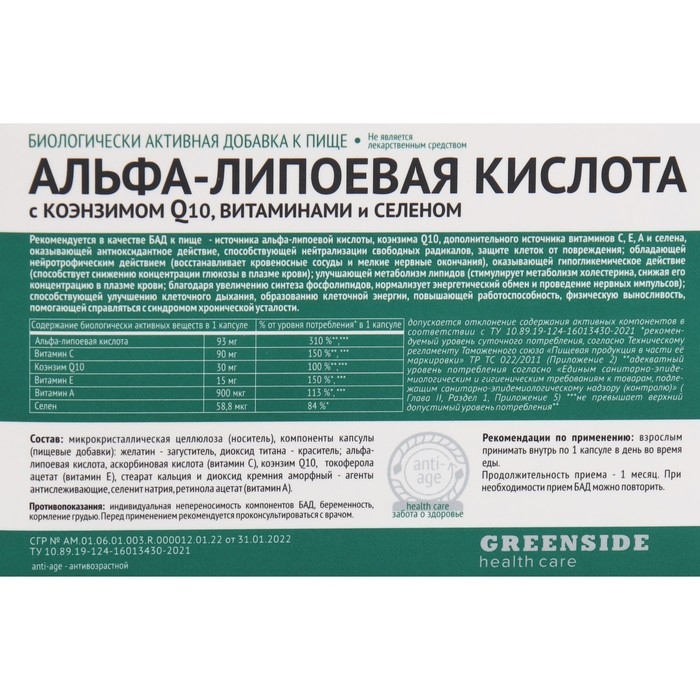 АЛЬФА-ЛИПОЕВАЯ КИСЛОТА С КОЭНЗИМОМ Q10 ВИТАМИНАМИ И СЕЛЕНОМ