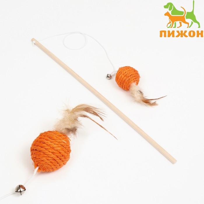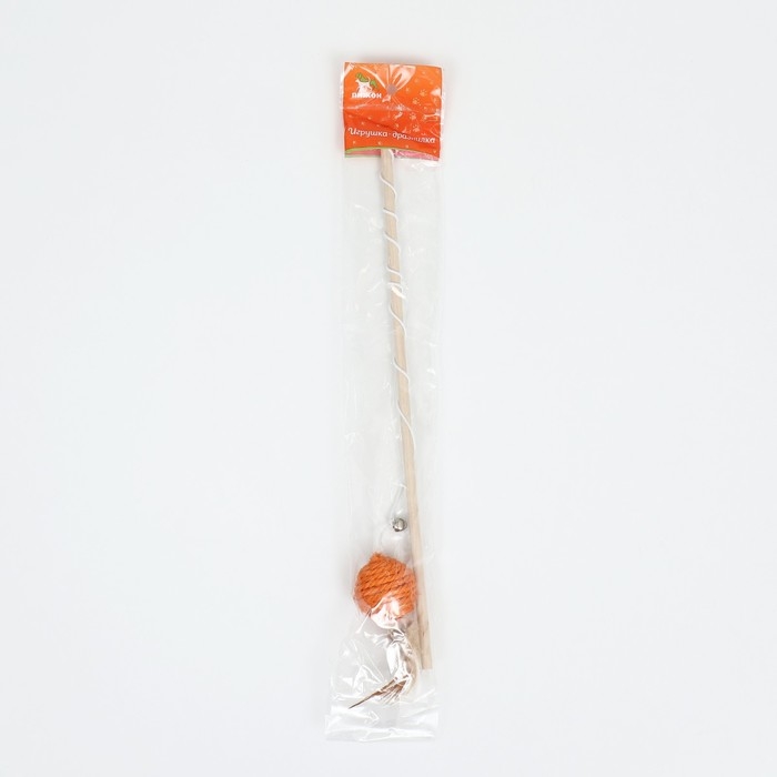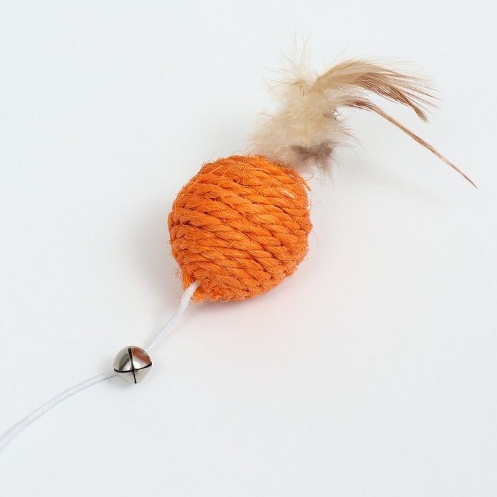 Дразнилка "Сизалевый шар" с перьями и бубенчиком, на деревянной ручке, 40 см, оранжевый шар