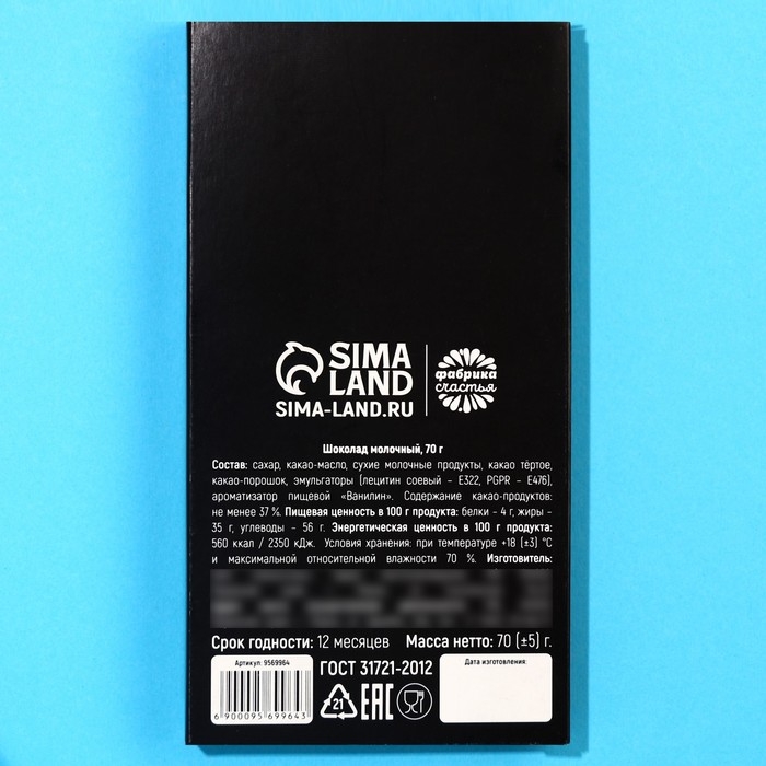 Состав: сахар, какао-масло, сухие молочные продукты, какао-тёртое, какао-порошок, эмульгаторы (лецитин соевый Е322, PGPR- E476), ароматизатор, пищевой "Ванилин".