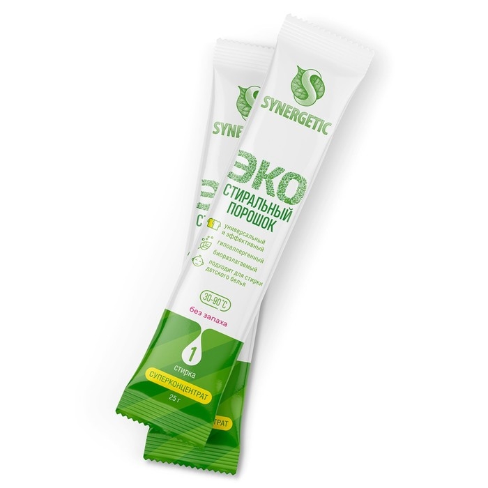 Стиральный порошок SYNERGETIC - экологичный, безопасный, универсальный, гипоаллергенный и эффективный суперконцентрат в стиках. Биоразлагаемый порошок создан на основе безопасных растительных компонентов, не вызывает раздражения кожи, аллергии, не оставляет запаха и подходит для стирки детского белья 0+ и одежды людей с чувствительной кожей. Подходит для белого и цветного белья из натуральных и синтетических тканей, для ручной и машинной стирки. Комбинация пяти видов энзимов, растительных ПАВ и натурального мыла эффективно удаляет загрязнения с волокон ткани даже в холодной воде и при коротких циклах стирки. Уникальный комплекс зеленых хелатов помогает устранить инкрустацию (посерение): естественный белый цвет возвращается к вещам уже после нескольких стирок. Стиральный порошок быстро растворяется в воде и не остается в одежде, полностью выполаскивается из волокон ткани. Экономичный и практичный формат стика удобен не только при использовании дома, но и для путешествий любым видом транспорта. Аккуратно оторвите край бумажного стика и засыпьте порошок в отсек стиральной машины, предназначенный для моющего средства. Закройте отсек и включите стиральную машину в соответствии с инструкцией. Используйте 1 стик порошка на 5 кг белья, для стирки сильно загрязнённого белья используйте 2 стика порошка. При ручной стирке полностью растворите порошок из 1 стика в 5 литрах воды, затем положите бельё и постирайте. Соблюдайте режим стирки, указанный на ярлыке изделия. Не наносите порошок непосредственно на ткань во избежание изменения её цвета. Стирайте цветные вещи при температуре не выше 40 °С. Не используйте для стирки шерсти, шелка, деликатных и мембранных тканей. Рекомендуемая температура стирки 30 - 40 °С. Новые, а также белые и цветные вещи стирайте отдельно, если степень устойчивости окраски ткани не известна. Беречь от детей. При попадании средства в глаза промыть водой. Использовать строго по назначению. Подготовленная вода > 30%; комплекс К-тензидов (растительного происхождения) 5–15%; гидрофилизирующий растительный полимер < 5%; растительный полимер < 5%; бензоат натрия < 5%; гипоаллергенная парфюмерная композиция с эфирными маслами < 5%; растительные энзимы без ГМО < 5%.