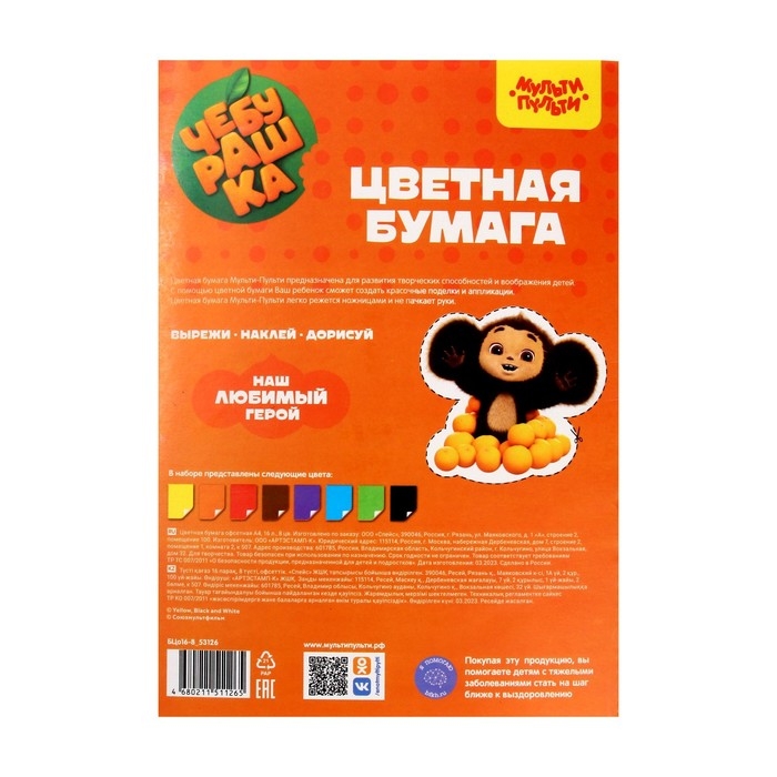 Набор цветной офсетной бумаги "Мульти-Пульти" серии "Чебурашка" отлично подойдет для творчества. На оборотной стороне обложки расположен персонаж, которого можно вырезать и сделать с ним аппликацию. Бумага имеет размер 200 х 280 мм. Плотность бумаги – 65 г/м2. В наборе представлено 8 ярких цветов офсетной бумаги на 16 листах.