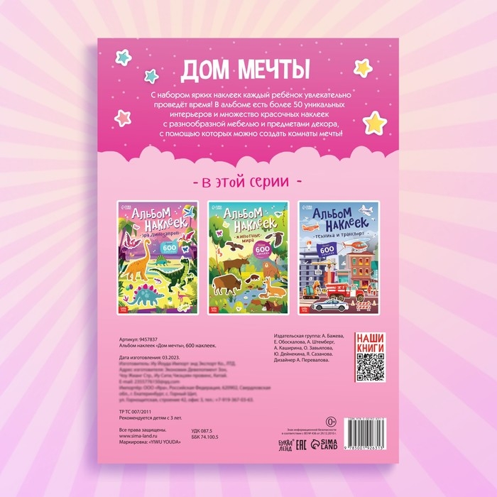 С этим альбомом ребёнок увлекательно проведёт время. Малыш найдёт множество красочных наклеек с разнообразной мебелью и предметами декора, с помощью которых можно создать комнату мечты. А также 15 разворотов, куда можно разместить наклейки.