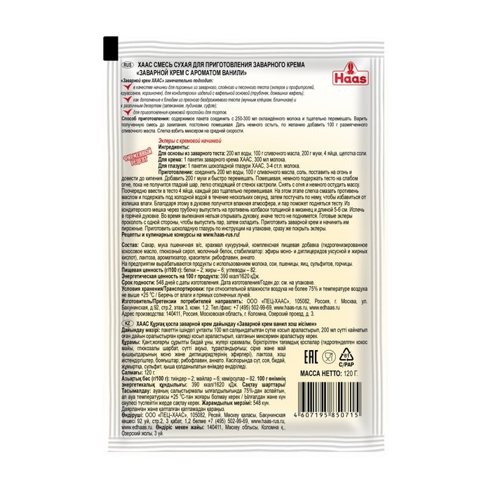 Заварной крем ХААС идеален в качестве начинки для пирожных из заварного, слоёного и песочного теста (эклеров и профитролей, круасанов, корзиночек), а также для кондитерских изделий с вафельной основой (трубочек, домашних вафель). Отличная добавка к блюдам из пресного бездрожжевого теста (мучным клёцкам, блинчикам). Может использоваться в качестве кремовой прослойки для тортов, а также дополнение к различным десертам (запеканкам, пудингам, суфле). Приготовление классического заварного крема теперь не требует много времени.