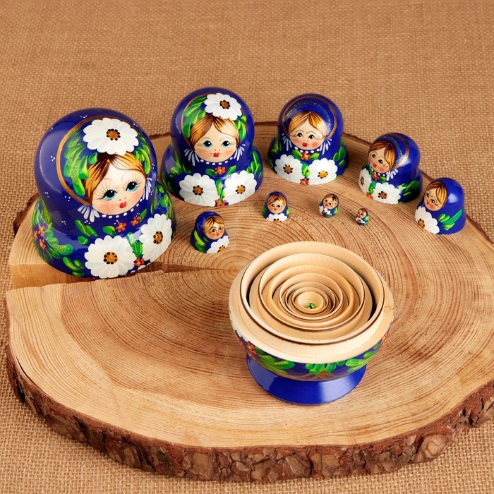 Матрёшка «Белые цветы», синее платье, 10 кукольная, 12 см