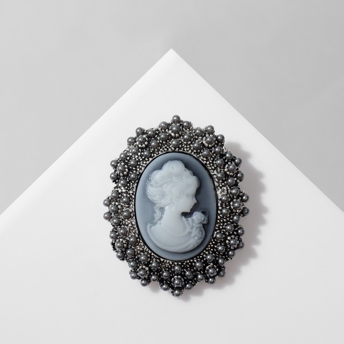 Брошь "Камея" в жемчуге, цвет серый в чернёном серебре