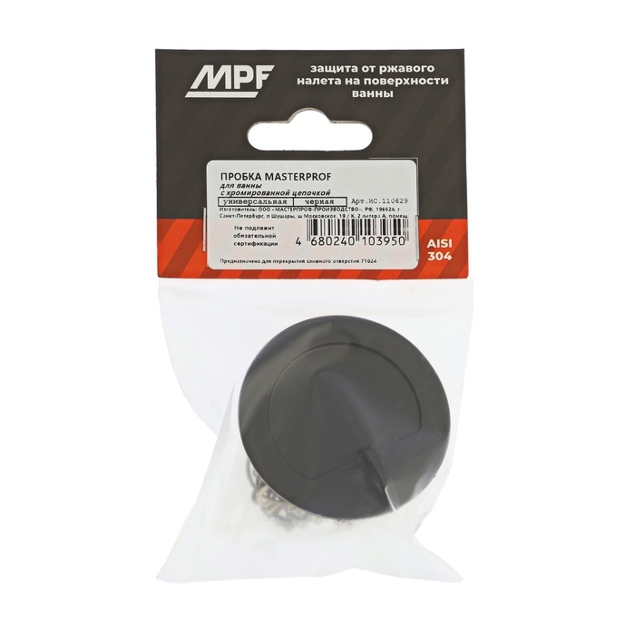 Пробка для ванны Masterprof ИС.110629, d=45 мм, ПВХ, с хромир. цепочкой, черная