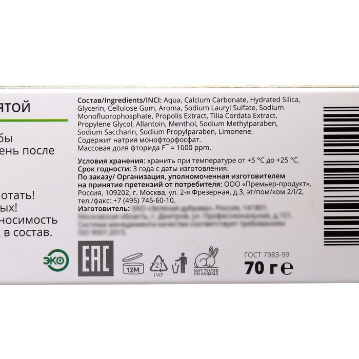 Зубная паста с прополисом, липой и мятой. Содержит только натуральные компоненты. Зубная паста разработана и произведено в соответствии с международными стандартами производства. Экстракт липы, входящий в состав оказывает укрепляющее и тонизирующее действия на десны Прополис – антибактериальный компонент, оказывает благоприятное действие на десны. Дарит свежее дыхание на целый день.