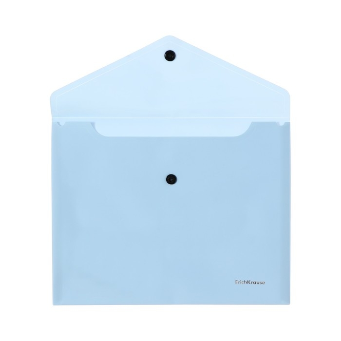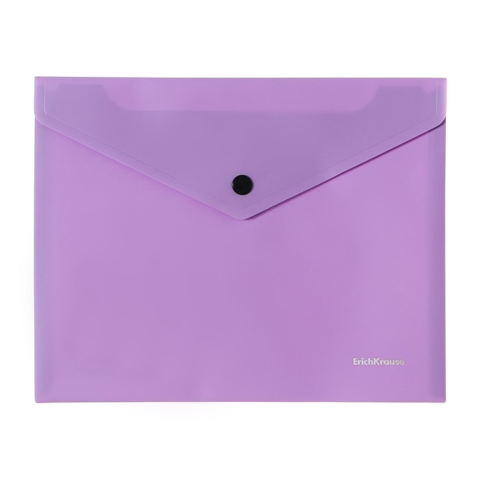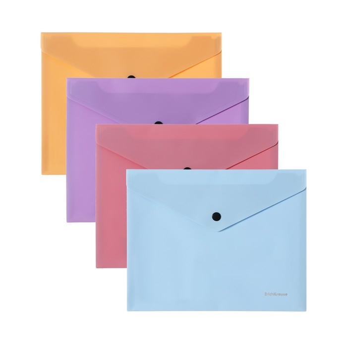 Папка-конверт на кнопке формата А5+ из высококачественного непрозрачного пластика с текстурой поверхности "софт-тач" на которой не видно отпечатков пальцев и мелких царапин. Предназначена для хранения и транспортировки небольшого количества документов. Цвет папки - ассорти: бежевый, голубой, розовый, фиолетовый. Надежная застежка-кнопка обеспечивает быстрый доступ к документам. Размер - 240x191мм, толщина - 0.18мм. Код и баркод на каждой единице товара