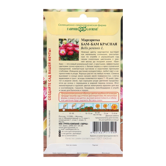 Семена Маргаритка "Бам-бам", ц/п, красная, 7 шт