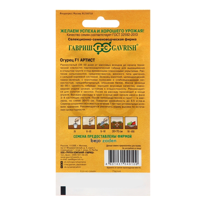 Раннеспелый (38–50 дней от массовых всходов до начала технической спелости) партенокарпический гибрид для выращивания в открытом грунте и под временными пленочными укрытиями. Растение индетерминантное, сильнорослое, средневетвистое, женского типа цветения, с сильной корневой системой. Зеленец короткий, цилиндрический, темно-зеленый, с короткими полосами и слабовыраженной пятнистостью, среднебугорчатый, опушение белое. Масса зеленца 90–95 г. Ценность гибрида: хорошие вкусовые качества, равномерная отдача урожая, устойчив к кладоспориозу. Рекомендуется для салатов и засолки. Посев на рассаду производят в конце апреля. Высадка рассады в грунт в конце мая – начале июня в фазе 3–4 настоящих листьев. Посев непосредственно в грунт — в мае – июне, по схеме 30х70 см. Товарная урожайность до 8,5 кг/м2.