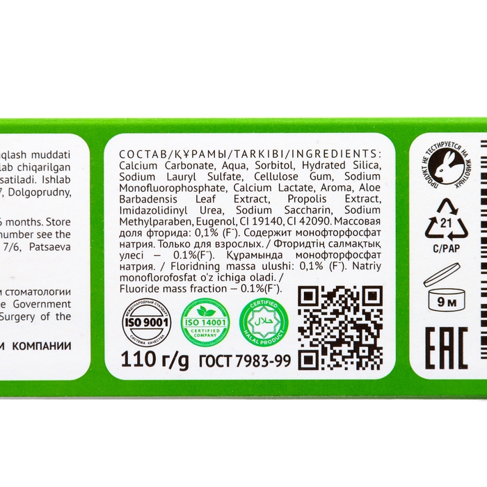 Состав: Calcium Carbonate, Aqua, Sorbitol, Hydrated Silica, Sodium Lauryl Sulfate, Cellulose Gum, Sodium Monofluorophosphate, Calcium Lactate, Aroma, Aloe Barbadensis Leaf Extract, Propolis Extract, Imidazolidinyl Urea, Sodium Saccharin, Sodium Methylparaben, Eugenol, CI 19140, CI 42090. Массовая доля фторида: 0,1% (Fˉ). Содержит монофторфосфат натрия.
