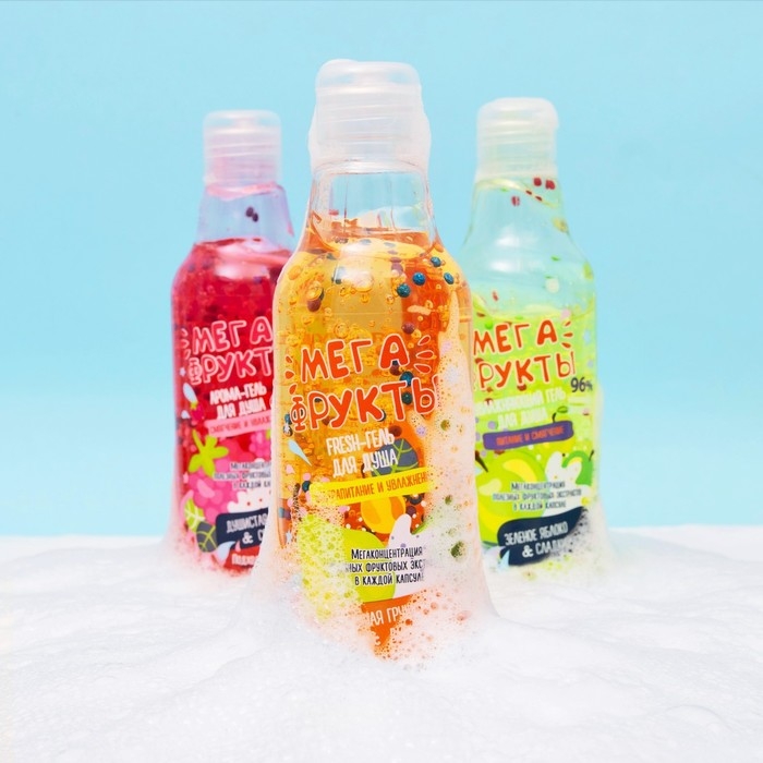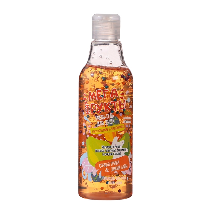 Бодрящий гель для душа "МЕГА ФРУКТЫ" на основе натуральных ингредиентов, мягко очищает даже очень сухую кожу, а сочный, свежий аромат груши и лайма гарантирует заряд позитива и хорошего настроения!
