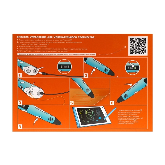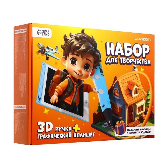 Набор для творчества Luazon включает в себя 3D-ручку, трафареты, пластик PLA (20 цветов), детские ножницы, напальчники и подложку для рисования. С его помощью можно создавать объёмные фигуры и развивать творческие навыки. В комплекте также идёт графический планшет для рисования и работы с графикой.