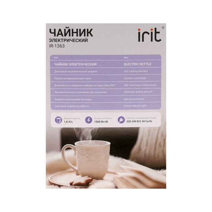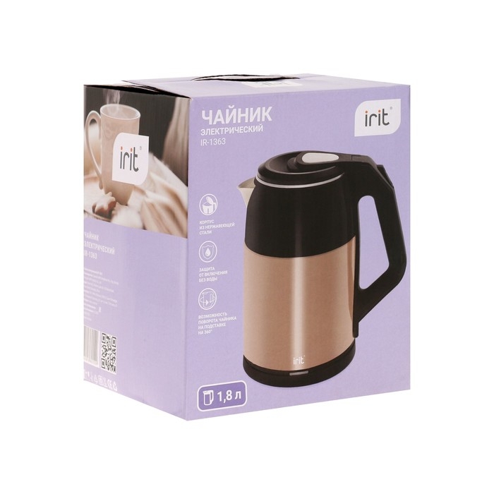 Чайник электрический IRIT IR-1363, металл, 1.8 л, 1500 Вт, бежево-чёрный