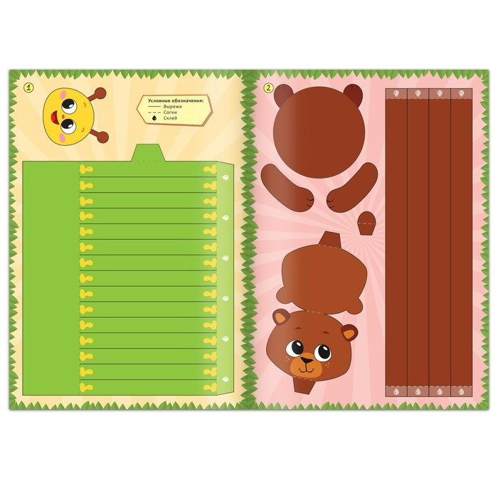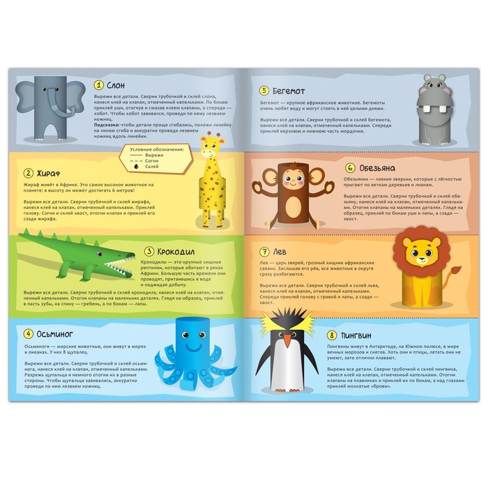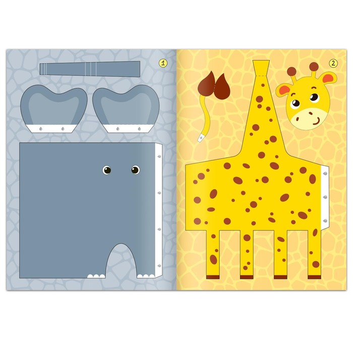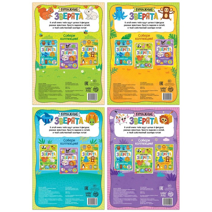 В каждой книге ребёнок найдёт по 8 бумажных выкроек фигурок. Малышу предстоит вырезать детали и склеить их между собой.