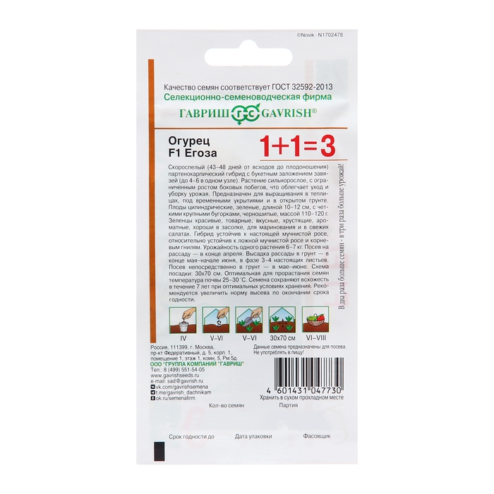 Семена Огурец "Егоза", F1, серия 1 + 1 20 шт.