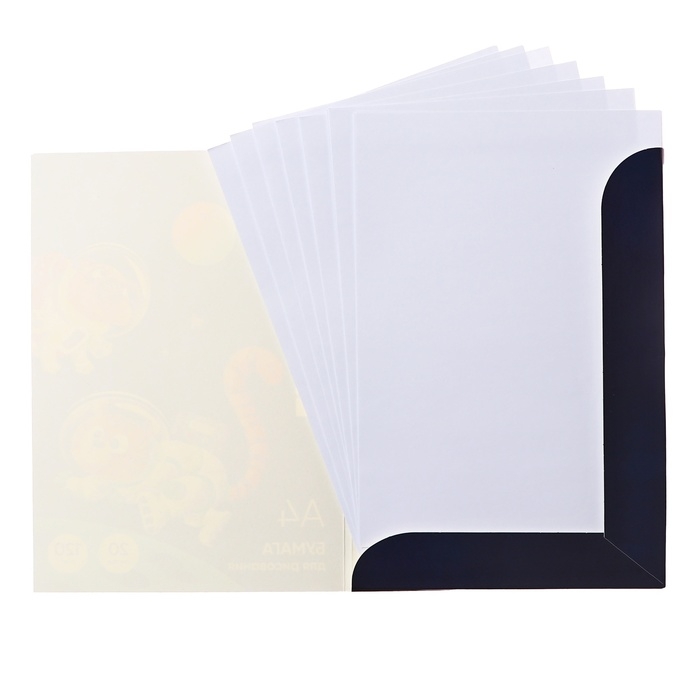 Бумага для рисования формата А4 (210x297). Папка из плотного картона. В блоке 20 листов бумаги плотностью 120 г/м2. Белизна бумаги — 100%.