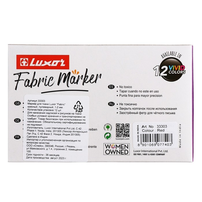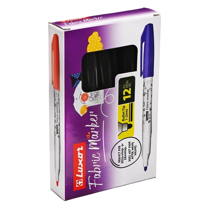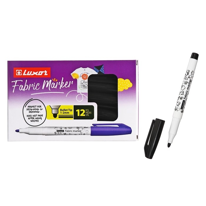 Маркеры для ткани Luxor "Fabric", подходят для различных видов тканей: от хлопковых сумок и футболок, до интерьерных тканей. Идеальны для дизайнеров по текстилю. Цвета автоматически закрепляются через 24 часа, или после глажки. Не смазываются при стирке 40°C (в зависимости от типа ткани и содержания натуральных волокон). Ручная стирка должна быть более бережной. Маркер имеет круглую форму корпуса и водостойкие пигментированные чернила на водной основе. Не токсичны. Не выцветают после многих стирок. Пишущий узел-1-2 мм. Цвет чернил- черный. Упаковка: картонная коробка по 12 штук