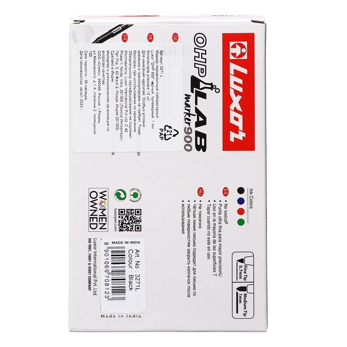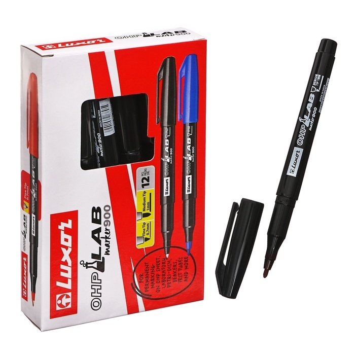 Маркер перманентный лабораторный Luxor "OHP 900" - деликатная маркировка на всех типах гладких поверхностей: стекло, металл, дерево, резина, пленка, фотопленка, картон. Рекомендуем использовать для для тонкой и точной маркировки на гладких и прозрачных поверхностях в лабораториях и медицинских учреждениях. Подходит для маркировки рентгеновских снимков, ацетатных пленок, Чашек Петри и другой лабораторной посуды. Тонкий пишущий узел позволяет наносить четкие и тонкие линии 1,00 мм