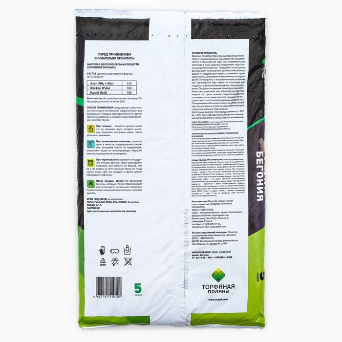 Торфяной грунт для бегонии – готовая смесь торфов различной степени разложения, обогащенная питательными веществами.Подходит для проращивания семян, черенкования, замены обычной почвы при посадке/пересадке бегонии, а также растений со схожими требованиями к составу грунта.Грунт легко пропускает влагу и воздух, благодаря чему корни растения получают достаточно кислорода и не загнивают.Содержит:Известняковую муку – нейтрализатор кислотности.Агроперлит – удобрение вулканического происхождения.Азофоску – комплексное удобрение.Питательные вещества: азот (NH4 + N03) ≤120 мг/л; фосфор (Р2О5) ≤180 мг/л; калий (К2О) ≤180 мг/л.