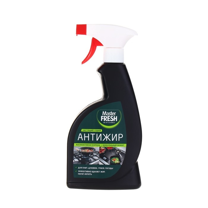 Чистящее средство Master FRESH АНТИЖИР спрей - это эффективный продукт для борьбы с жировыми загрязнениями на кухне. Оно идеально подходит для очистки плит, духовых шкафов, микроволновок, вытяжек и других поверхностей, подверженных накоплению жира.