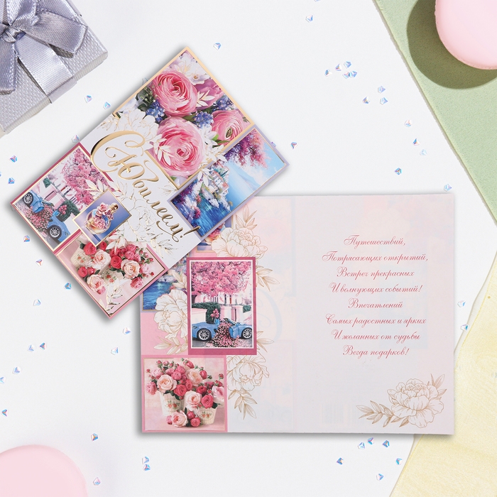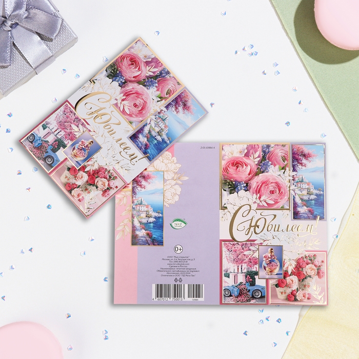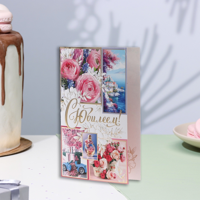 Открытка "С Юбилеем!" машина, букет, дом, тиснение, конгрев, А5