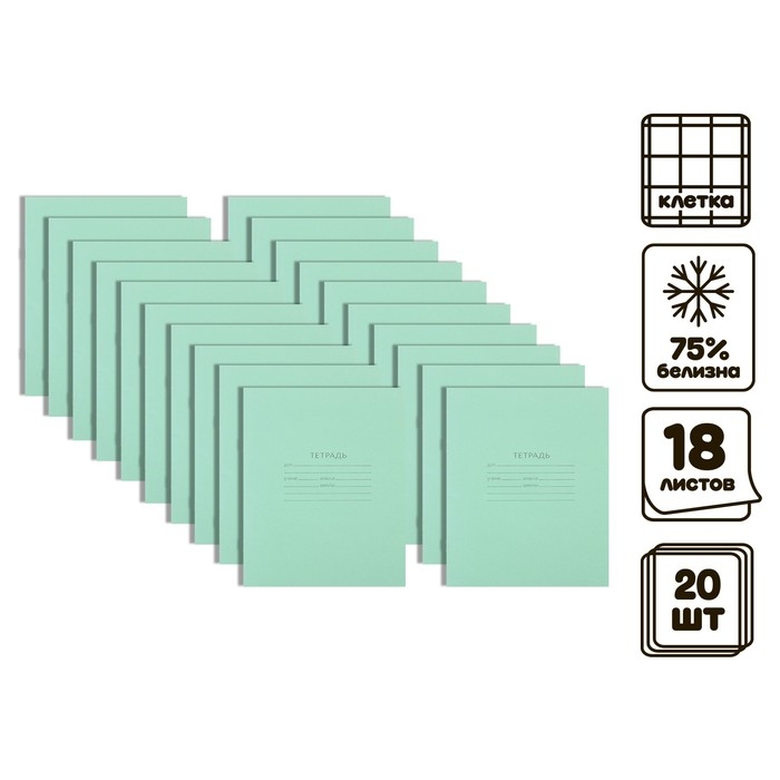 Комплект тетрадей из 20 штук, 18 листов в клетку КПК "Зелёная обложка", блок №2, 60 г/м2, белизна 75% (серые листы)