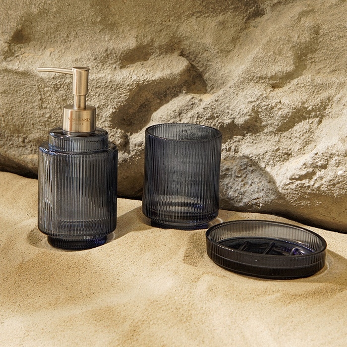 Выполненные из высококачественного стекла, элементы набора привлекают внимание своим гармоничным сочетанием синего и прозрачного цветов. Их лаконичный однотонный дизайн без рисунков позволяет легко интегрировать их в любое оформление ванной комнаты, создавая атмосферу порядка и спокойствия.