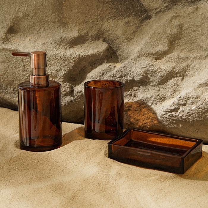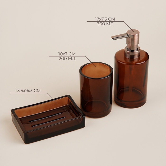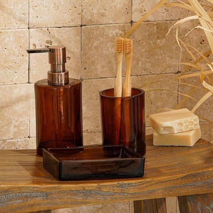 Выполненные из высококачественного стекла в утончённых коричневых и прозрачных оттенках, элементы набора подчеркнут изысканность вашего интерьера. Один из главных плюсов — оптимальный объём дозатора в 300 мл, что обеспечивает удобство использования и позволяет долго наслаждаться его функциональностью.
