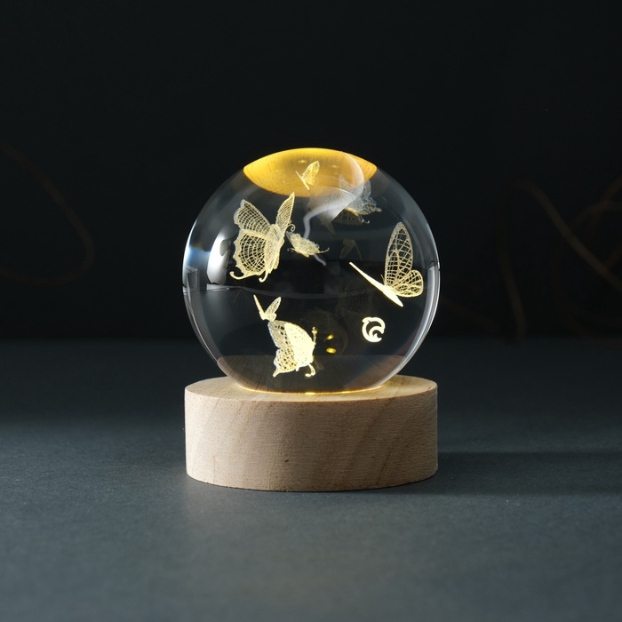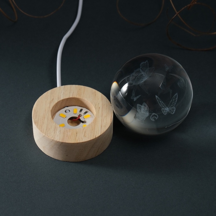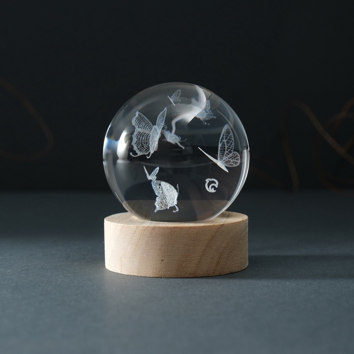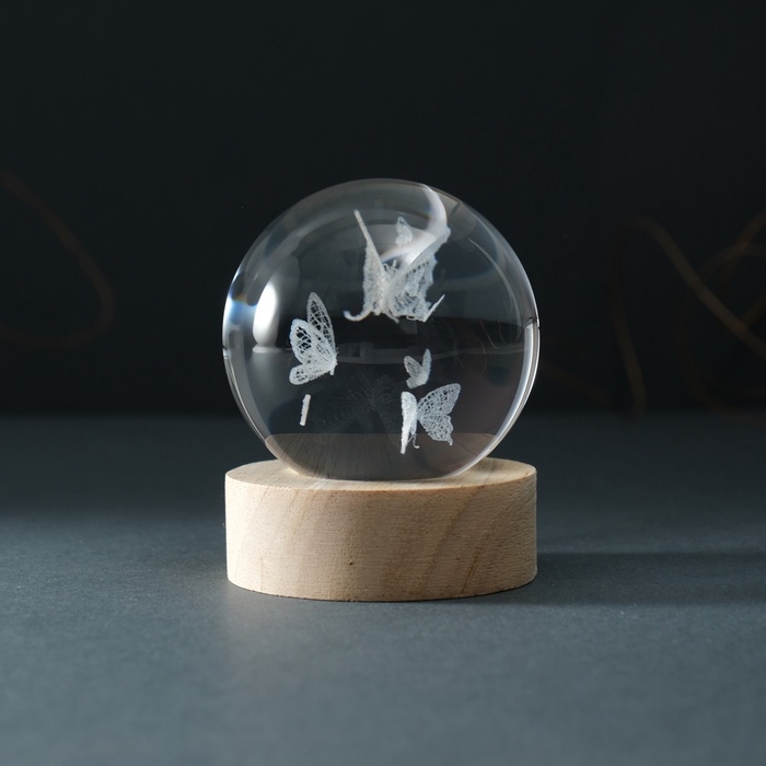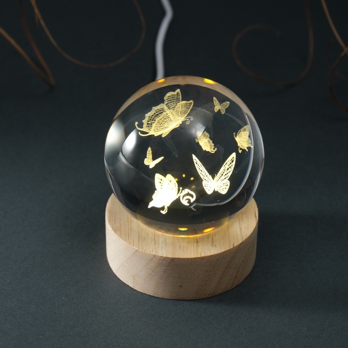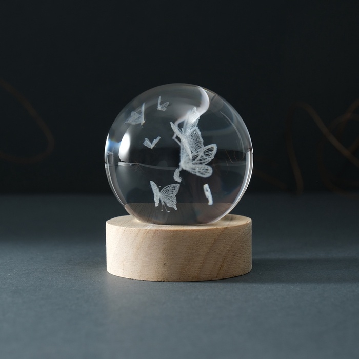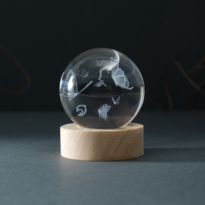 Сувенир стекло подсветка "Шар. Бабочки" d=6 см подставка дерево, USB