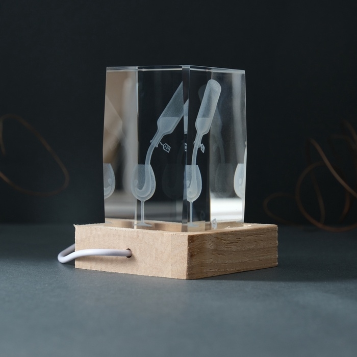 Сувенир стекло подсветка "Прямоугольник. Бокал и вино" подставка дерево, USB 7х7х10