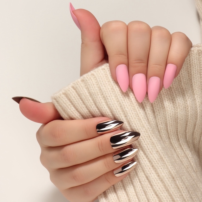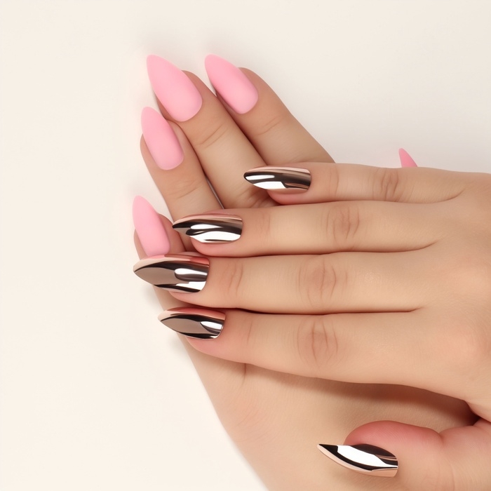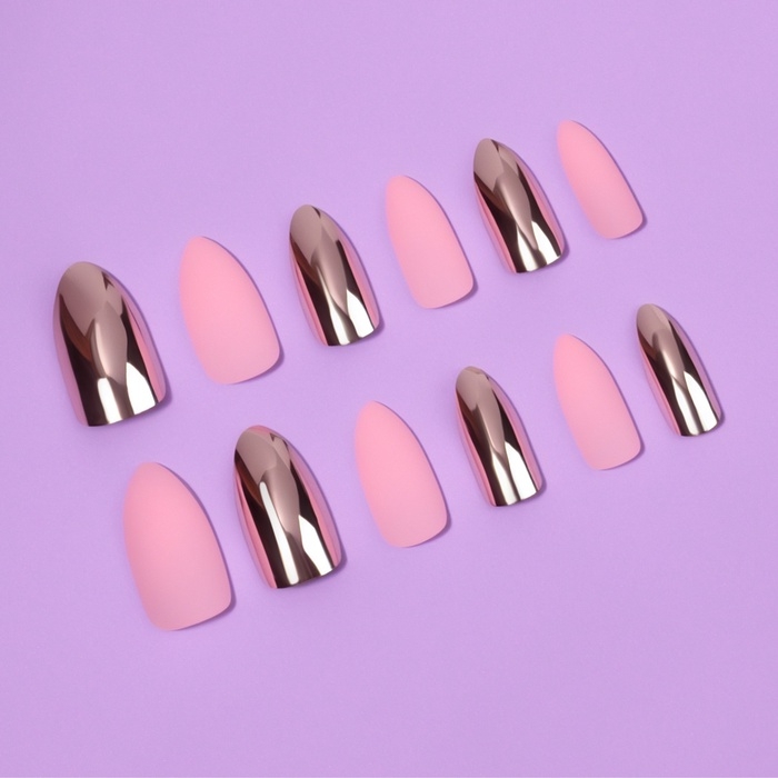 Накладные ногти, 12 шт, с клеевыми пластинами, форма миндаль, матовые/хромированные, розовые, золотистые