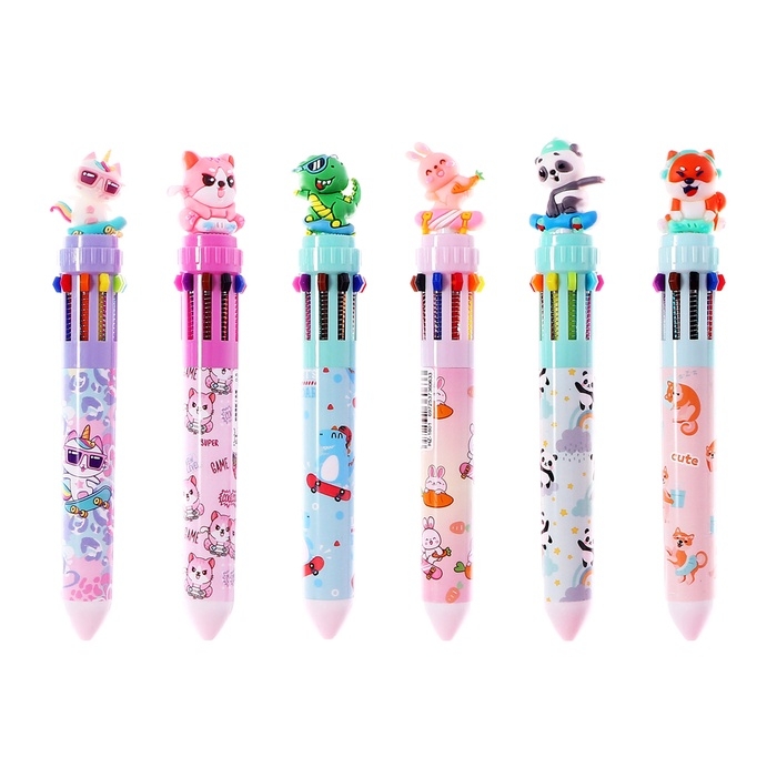 Ручка шариковая автоматическая, 10-ти цветная, штрихкод на штуке, МИКС Зверята