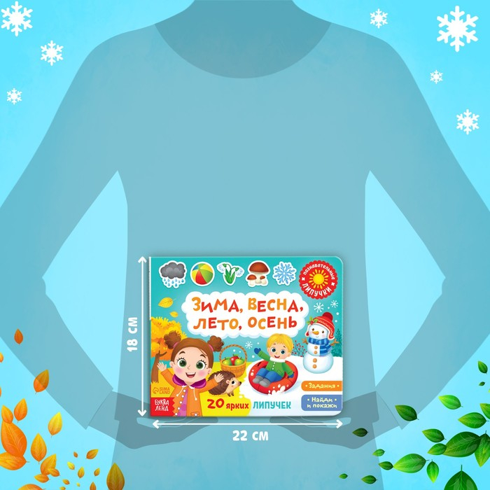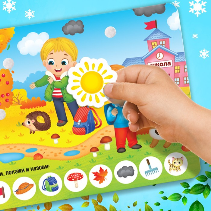 Обучающая книга с липучками «Зима, весна, лето, осень» направлена на изучение времён года и расширение кругозора у деток. Внутри ребёнок найдёт интересные задания и загадки, а также сможет поиграть в игру «Найди и покажи».