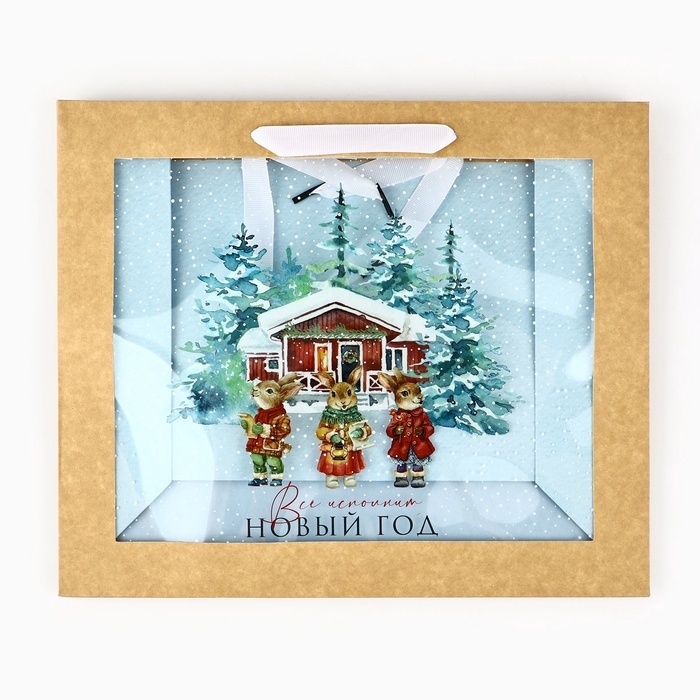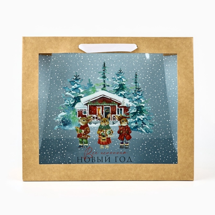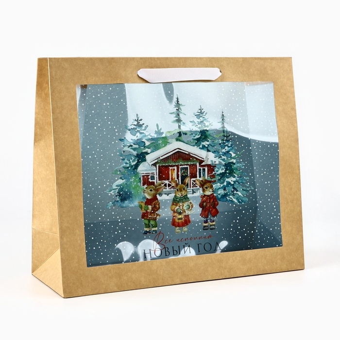 Пакет подарочный новогодний крафтовый с пластиковым окном «Загадай желание», 31 х 26 х 11 см