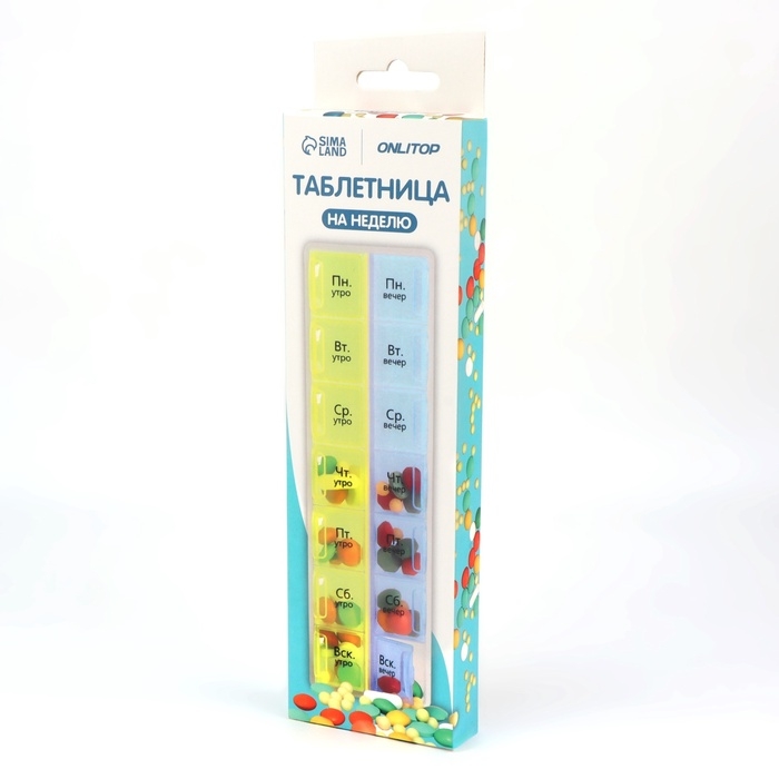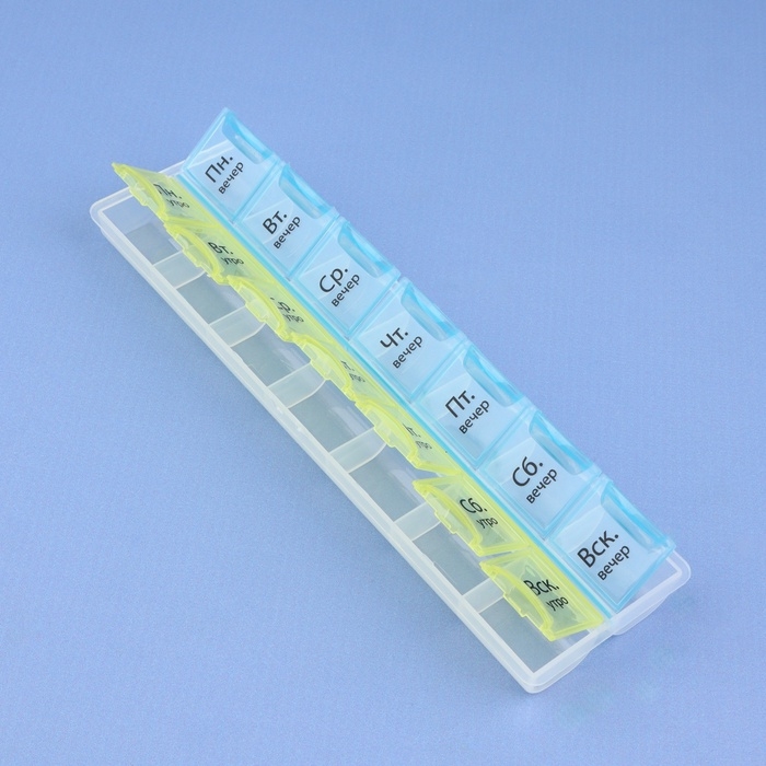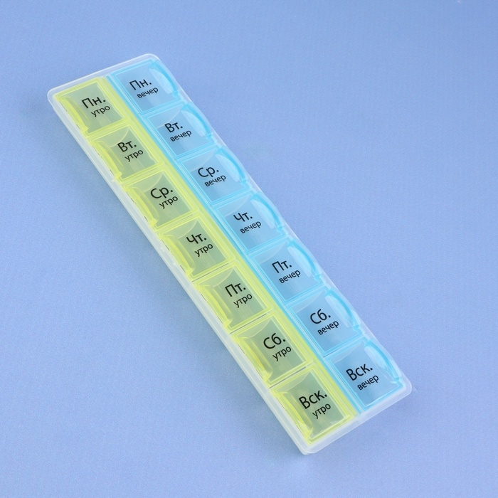 Таблетница - органайзер «Неделька», русские буквы, утро/вечер, 21,5 × 6,5 × 2 см, 14 секций, цвет жёлтый/голубой