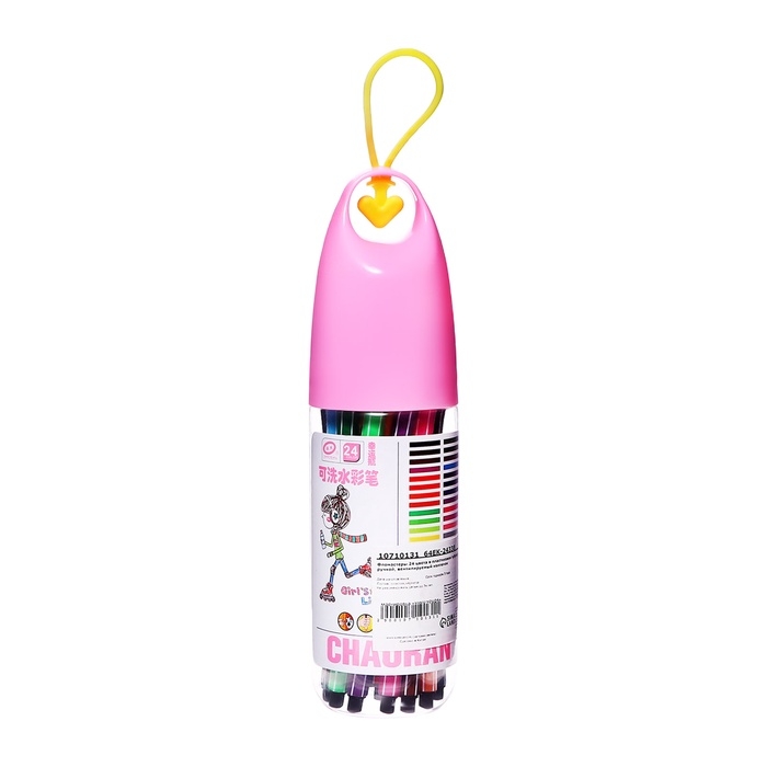 Фломастеры 24 цвета в пластиковом тубусе с ручкой, розовый, вентилируемый колпачок