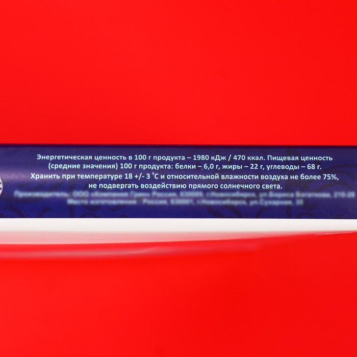 Энергетическая ценность в 100 г продукта – 1980 кДж / 470 ккал. Пищевая ценность (средние значения) 100 г продукта: белки – 6,0 г, жиры – 22 г, углеводы – 68 г.