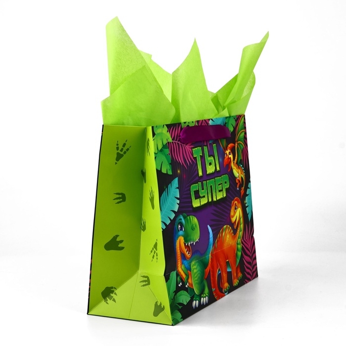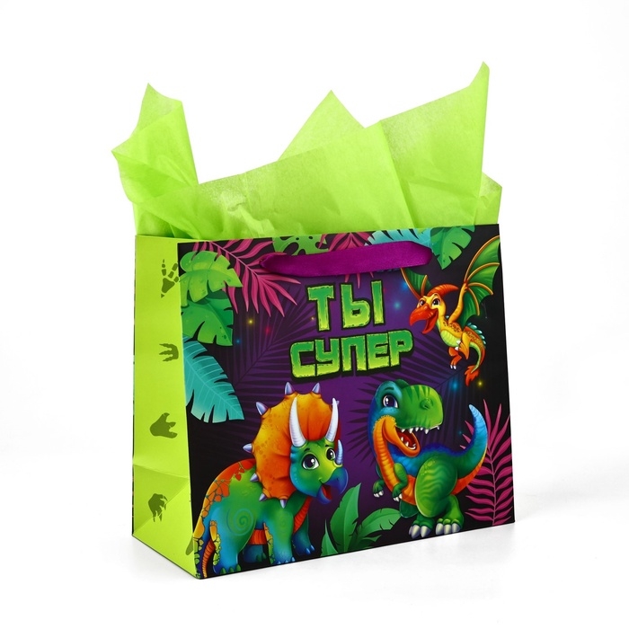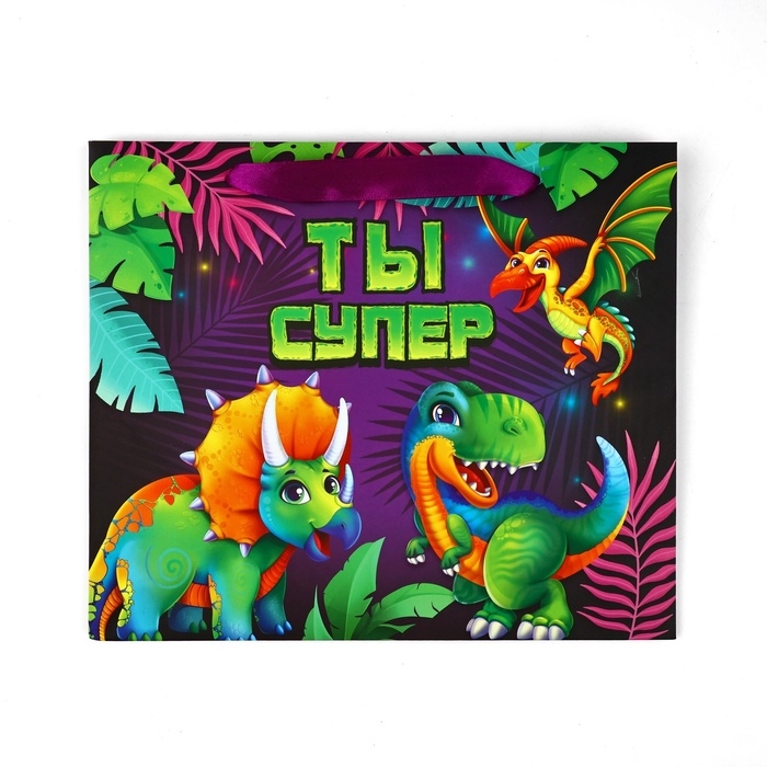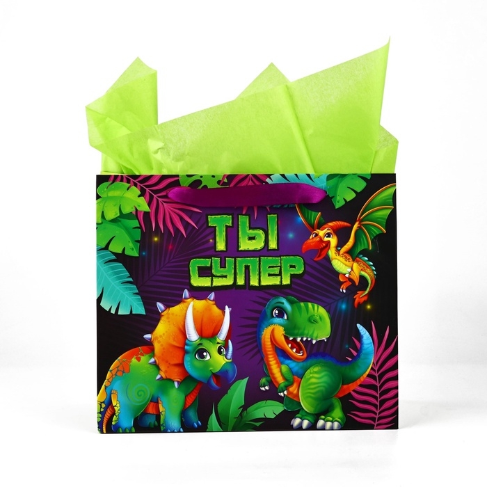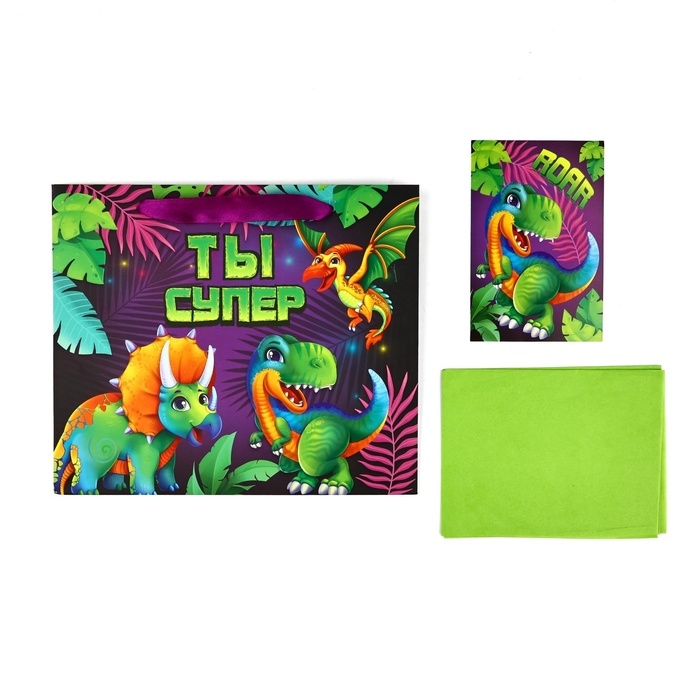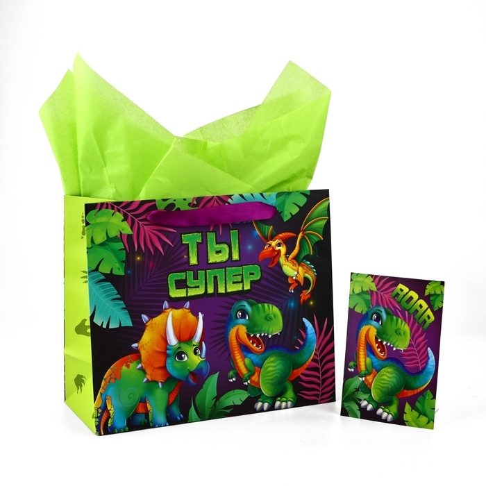 Пакет ламинированный двухсторонний «Динозаврики», с тишью и открыткой, ML, 23 × 27 × 11,5