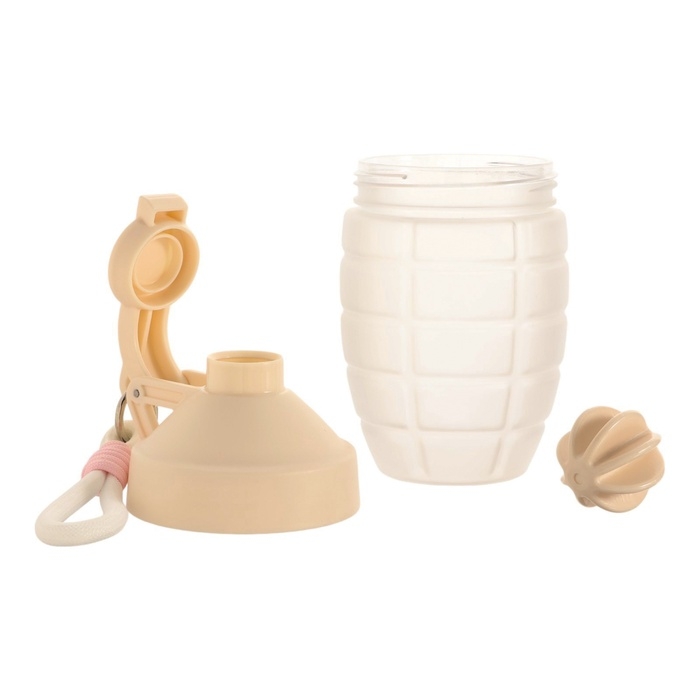 Выполнен в нежном бежевом цвете. Габариты шейкера — 18 х 12 см, что делает его удобным для транспортировки и использования в любых условиях. Оснащён специальным подвесом, который позволяет легко носить его с собой на тренировки, в дорогу или на работу.