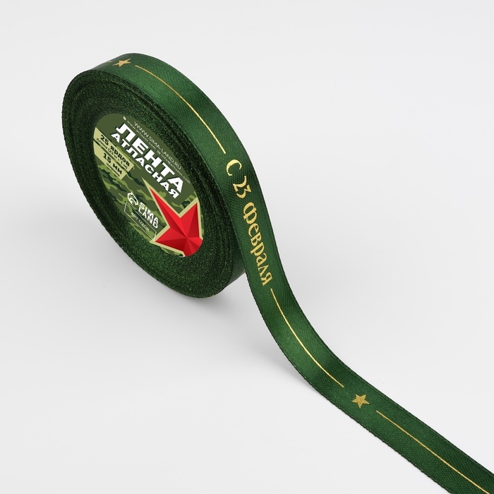 Лента атласная «С 23 Февраля!», 15 мм × 23 м ± 1 м, цвет зелёный