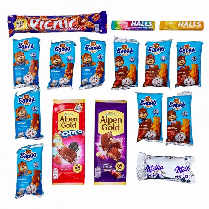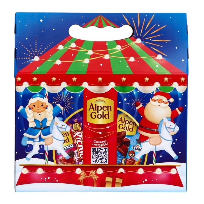 Внутри вы найдете любимый шоколад "Альпен Голд", который порадует своим насыщенным и утонченным вкусом. Его качественные ингредиенты заставят вас наслаждаться каждым кусочком. Также в набор входят шоколадные конфеты "Холс", известные своим ярким вкусом. Эти сладости идеальны для того, чтобы поделиться ими с друзьями и близкими, создавая атмосферу праздника.