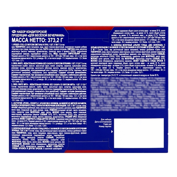 В состав набора входят любимый шоколад "Альпен Голд", который удивит вас своим вкусом. Этот шоколад станет отличным десертом на любом празднике. Также в "Пати Микс" вы найдете батончик "Пикник", который благодаря своей уникальной комбинации ингредиентов подарит вам неповторимые ощущения и заряд энергии на весь день.