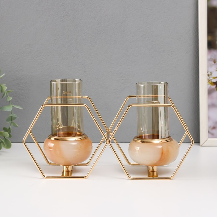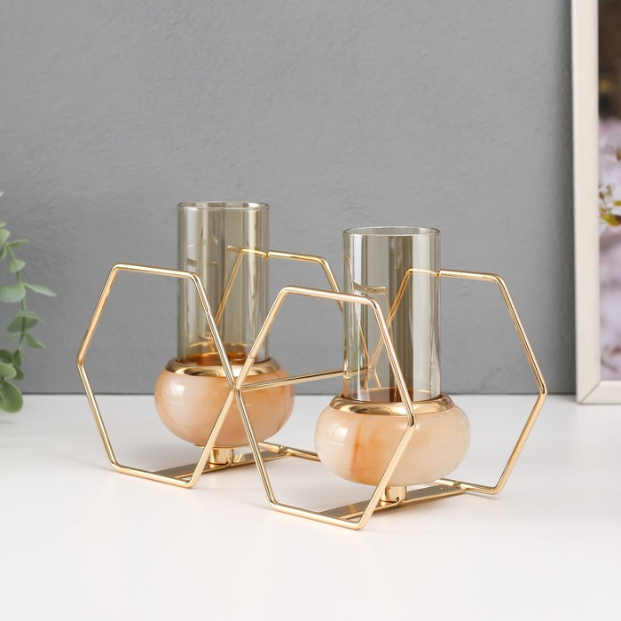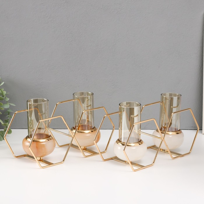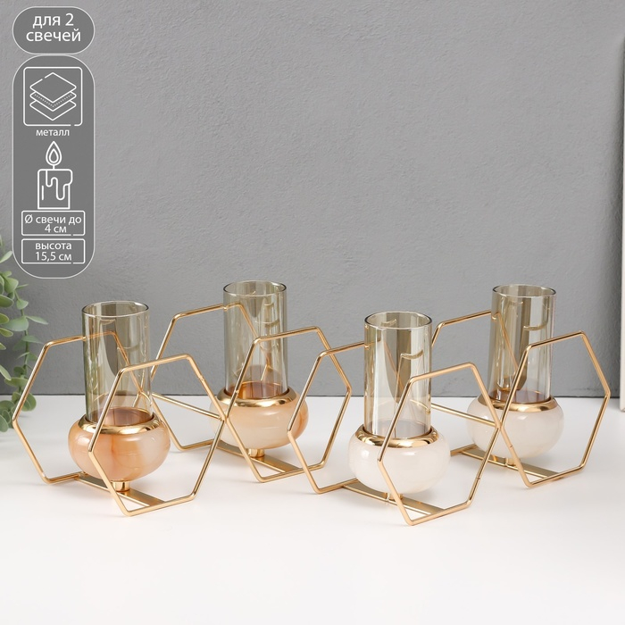 Подсвечник металл, стекло на 2 свечи "Шестигранники" белый с золотом 15,5х26,5х10,5 см