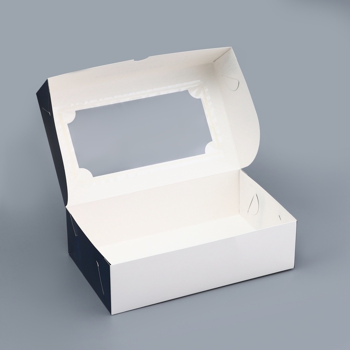 - Размер коробки составляет 25х15х7 см, что позволяет разместить внутри разнообразные кондитерские изделия: от небольших шоколадок до крупных конфет и даже пирожных.