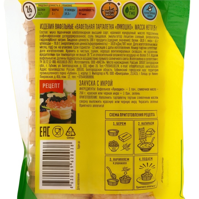 Эти тарталетки также отлично подходят для проведения праздников, фуршетов и семейных встреч. Их удобно подавать как отдельные порции, что приносит эстетическое удовольствие при подаче и позволяет легко угощать гостей. Радуйте своих близких уникальными угощениями, используя вафельные тарталетки "Лукошко" как основное дополняющее блюдо! С ними каждое событие станет особенным!