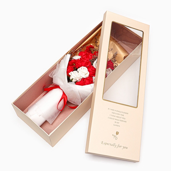 Букет мыльных красных и белых роз в коробке — это изысканный подарок, способный украсить любой праздник.
